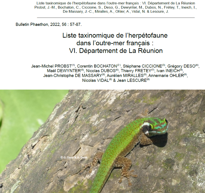 Nous avons le plaisir de partager ici la liste taxinomique commentée de l’herpétofaune du département de La Réunion à laquelle nous avons pu participer. Cette liste actualisée vient d’être publiée dans les colonnes du Bulletin Phaethon (une revue naturaliste locale) de l’association Nature et Patrimoine sous la direction éditoriale de Jean-Michel Probst. Pour mener à bien ce Lire plus …